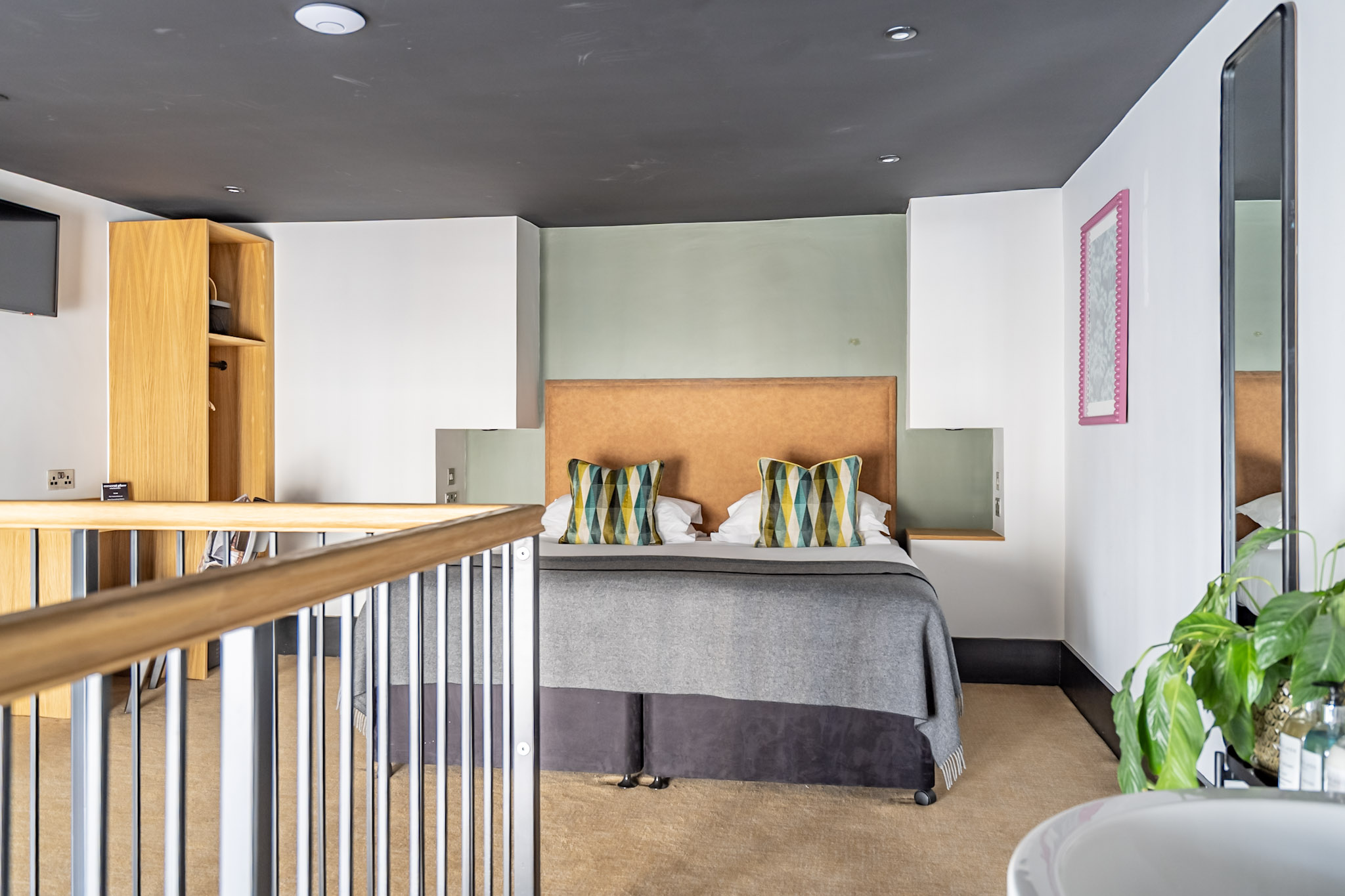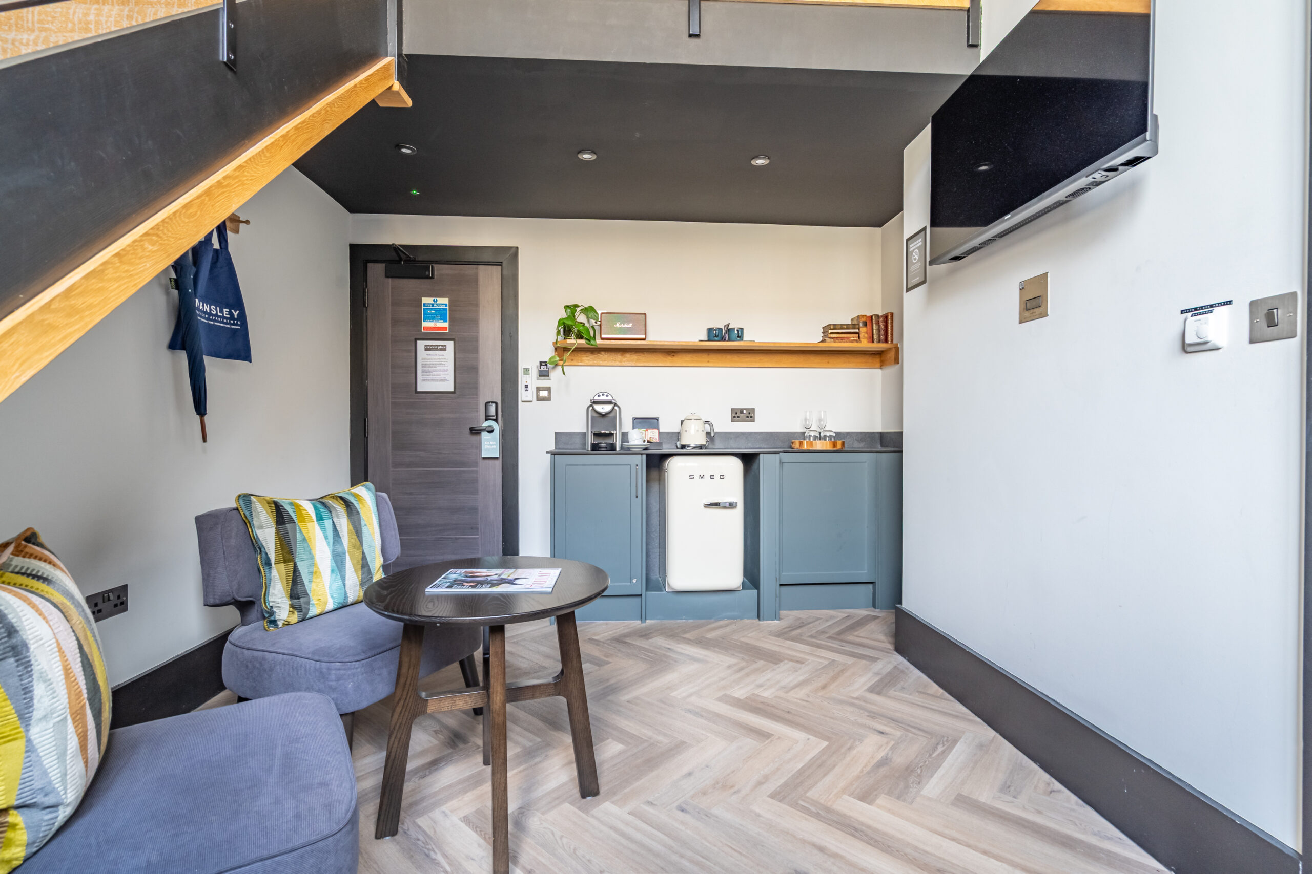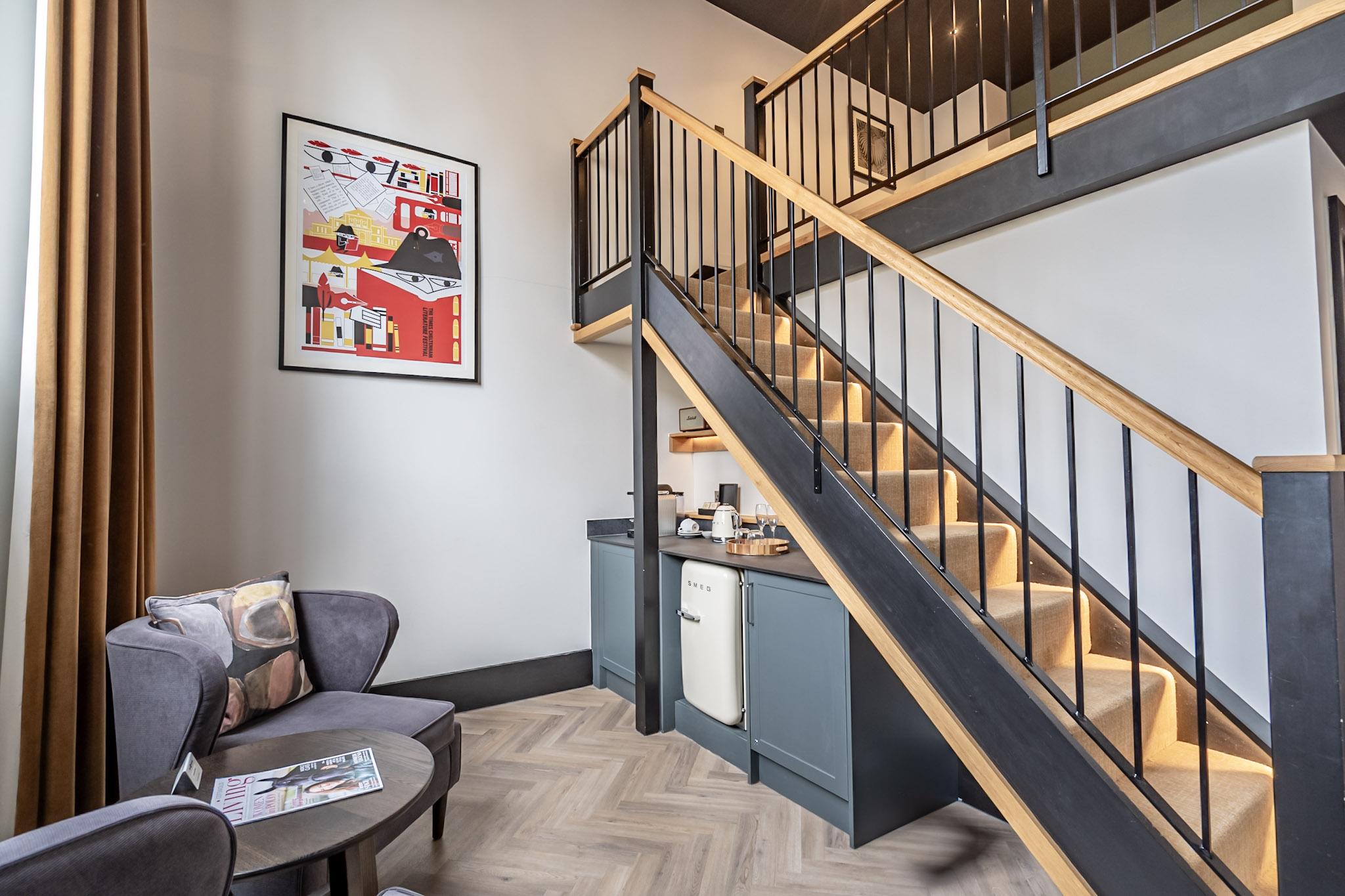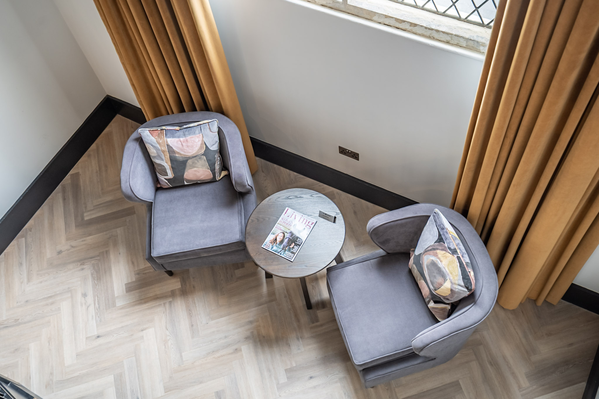 Step into timeless elegance with our Luxury Suite – a beautifully restored duplex apartment set within this historic Grade II listed chapel conversion. The lower level welcomes you with a stylish living area, a sleek Burlington shower room, and a compact kitchenette equipped with tea and coffee-making facilities and crockery for enjoying light meals or takeaways.