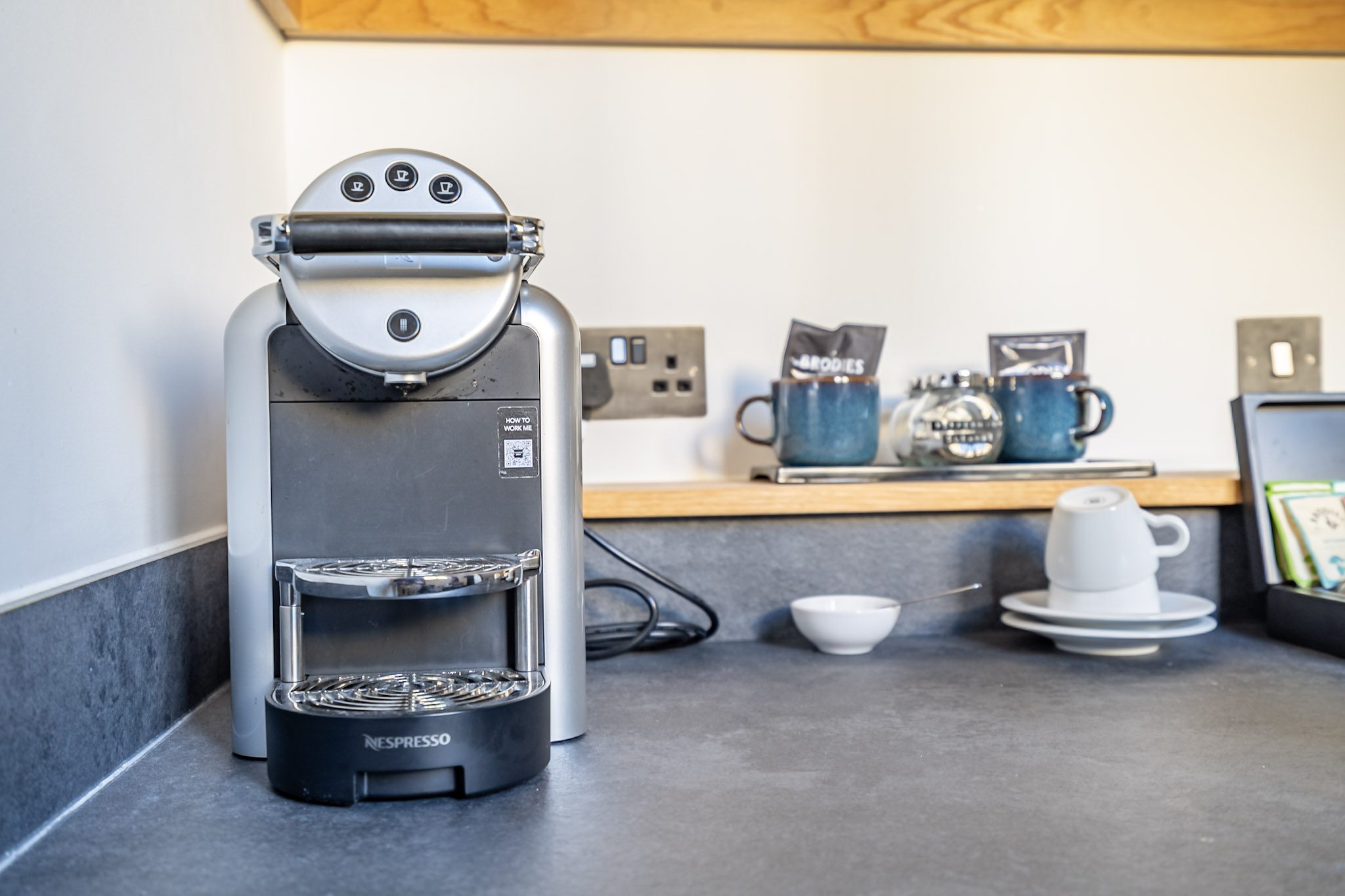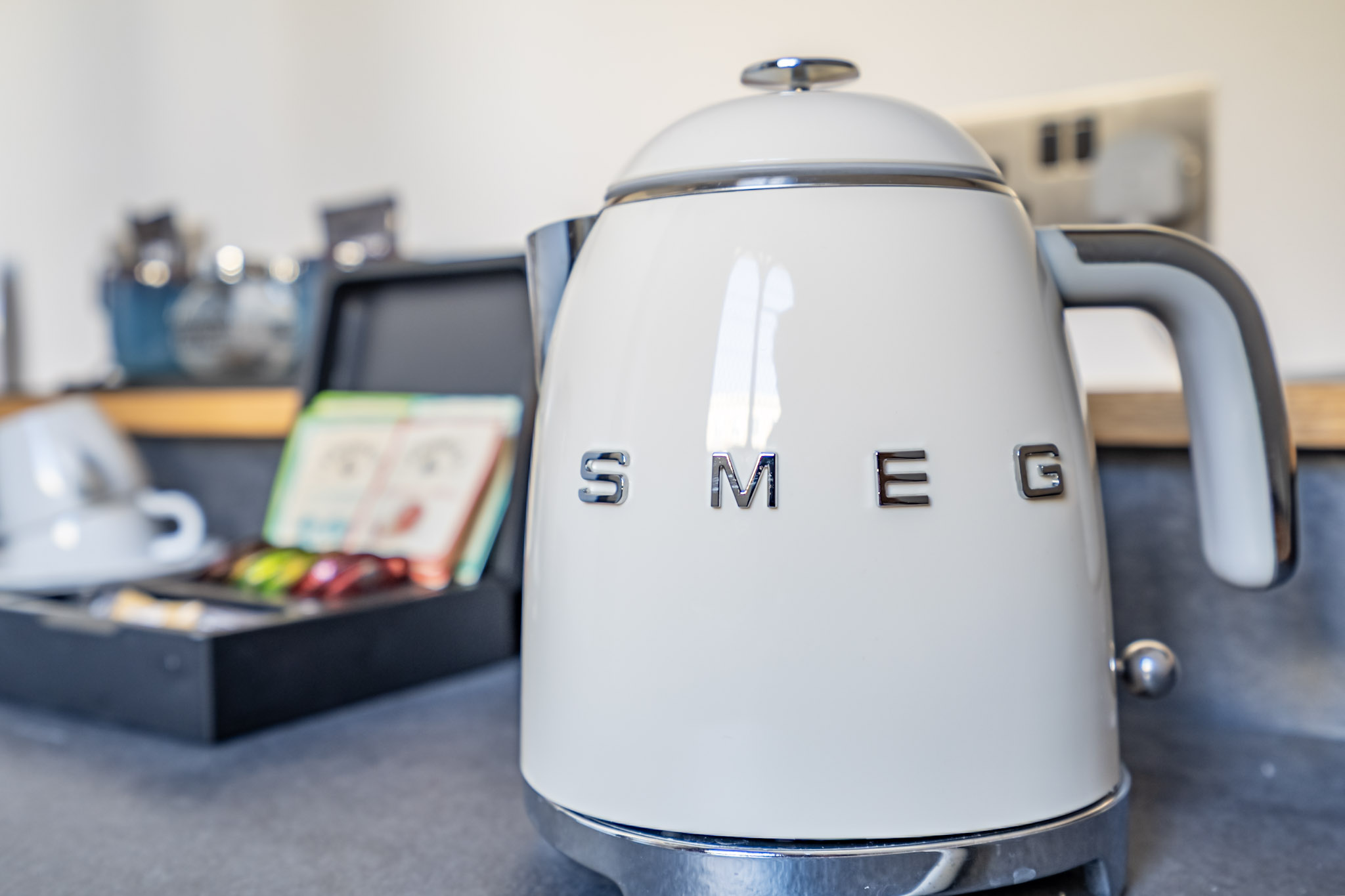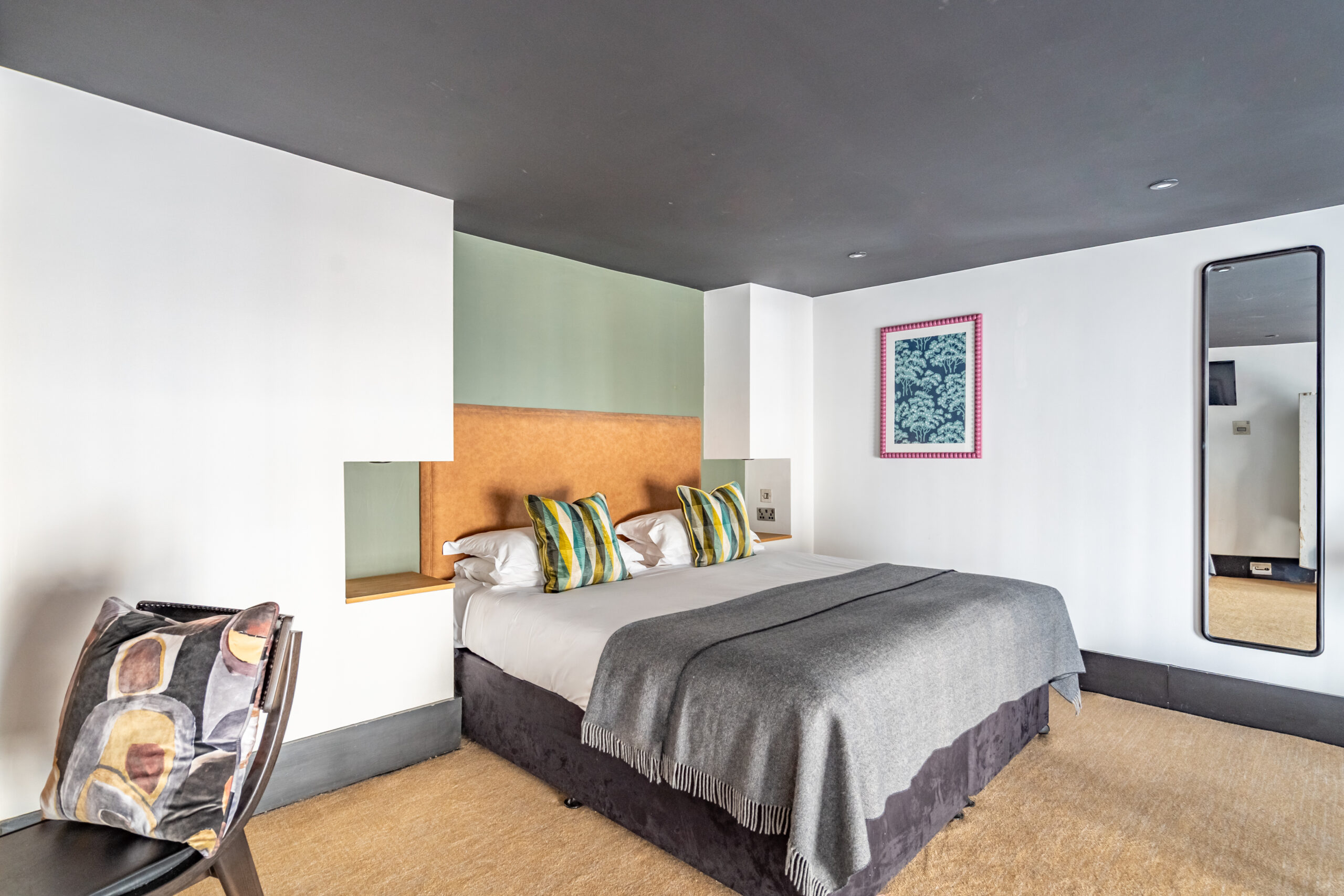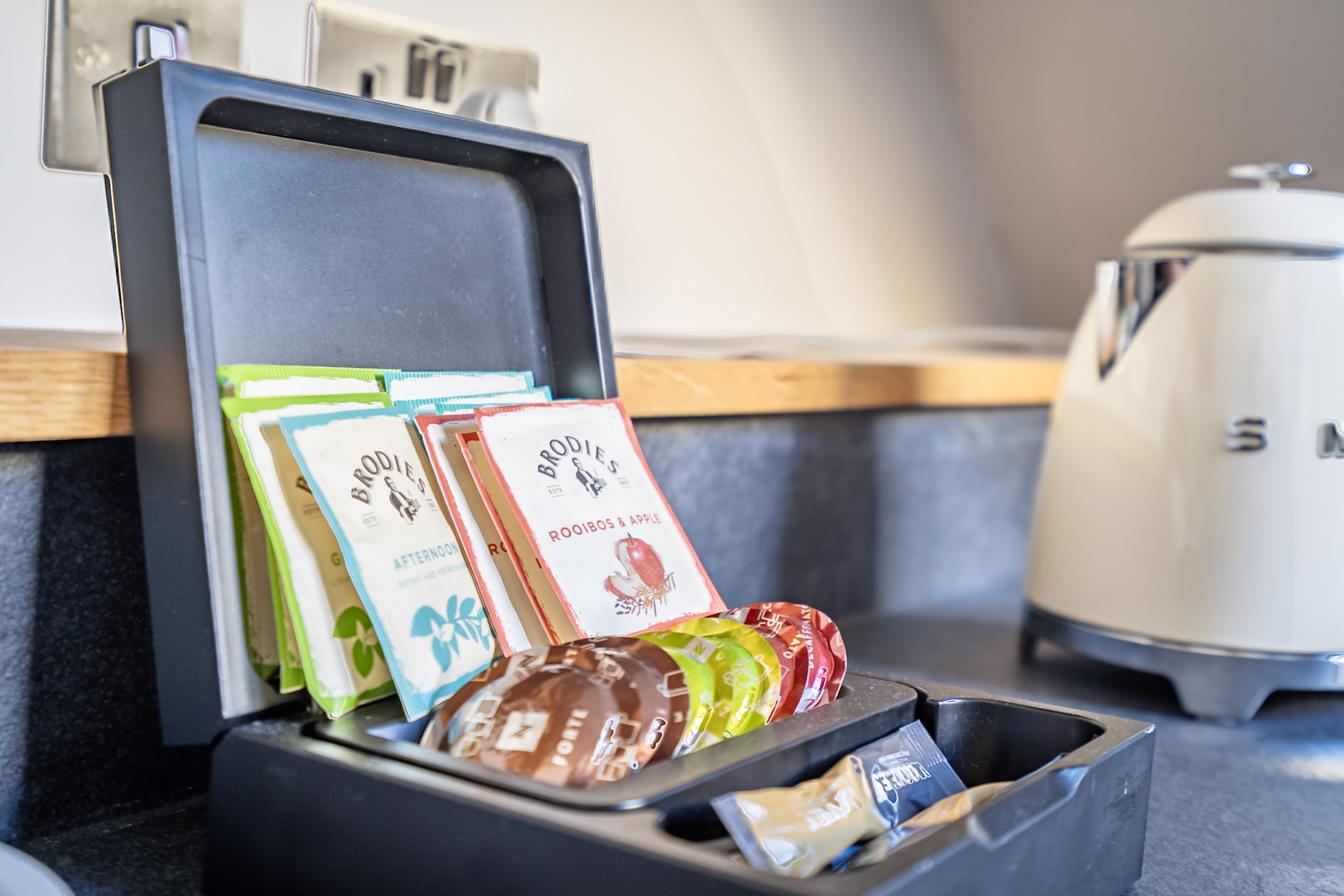 Step into timeless elegance with our Luxury Suite – a beautifully restored duplex apartment set within this historic Grade II listed chapel conversion. The lower level welcomes you with a stylish living area, a sleek Burlington shower room, and a compact kitchenette equipped with tea and coffee-making facilities and crockery for enjoying light meals or takeaways.