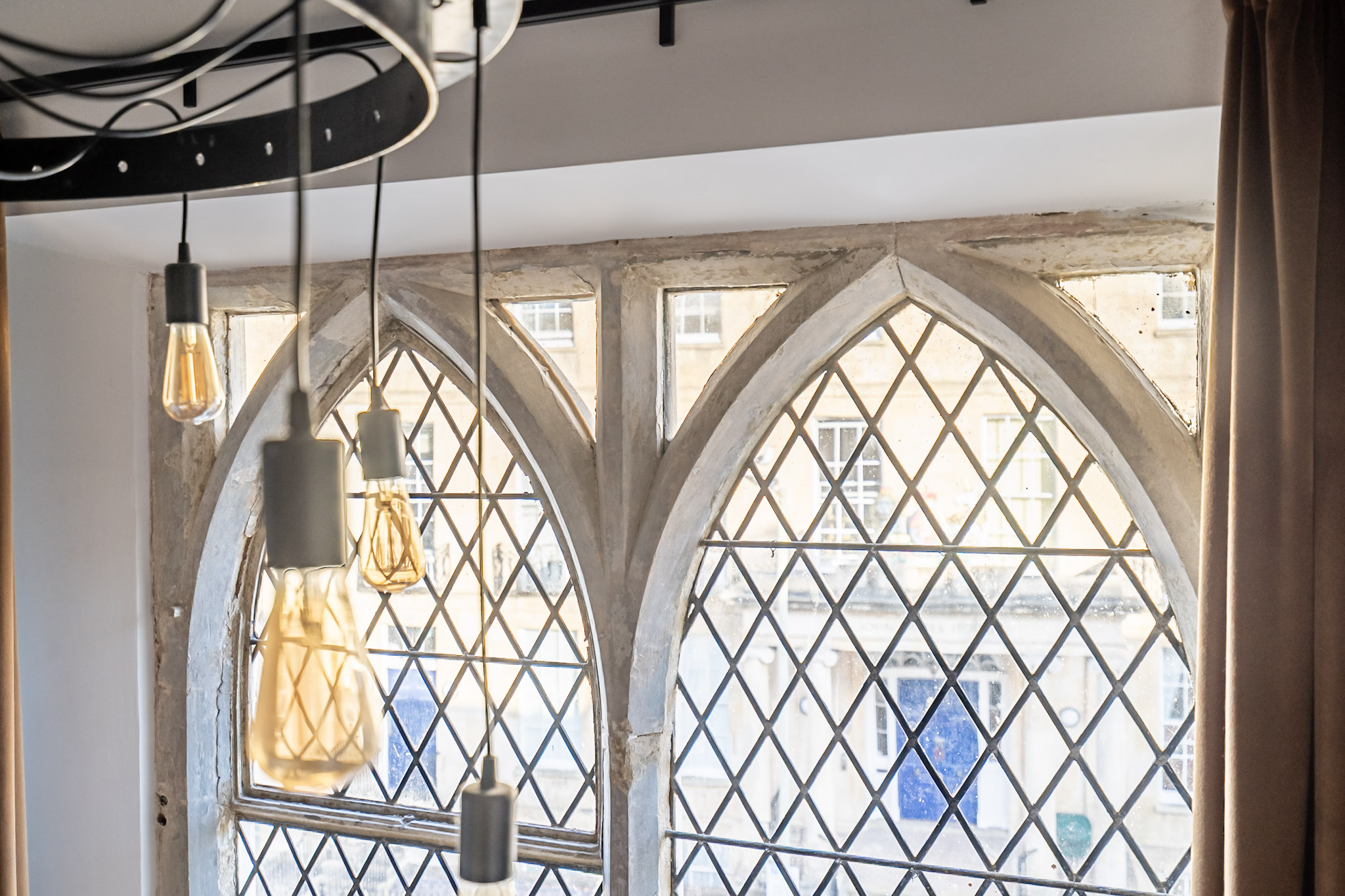 Climb the staircase to the upper mezzanine and you’ll find a stunning bedroom with a super king-size bed and a statement roll-top bath – perfect for soaking away the day in pure comfort. Original 19th-century chapel windows flood the space with natural light, casting soft shadows that create a uniquely serene atmosphere.