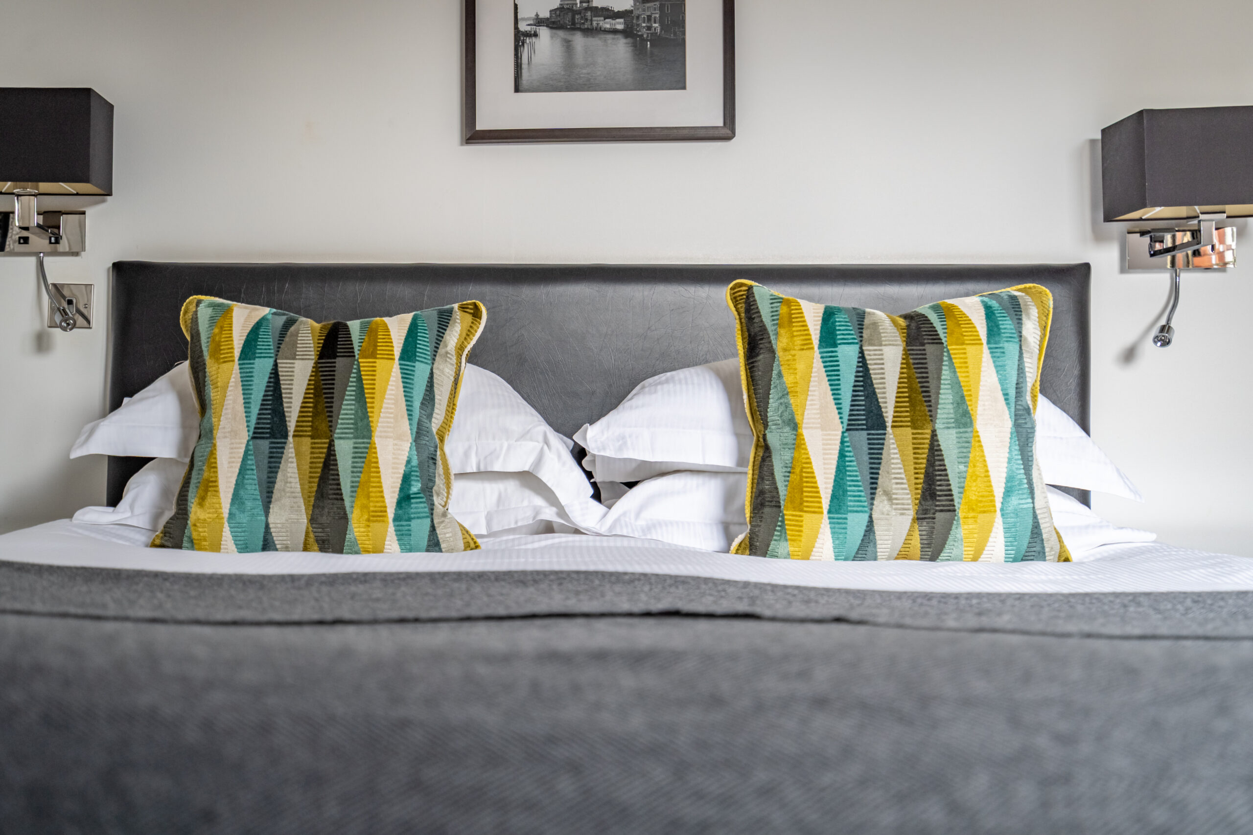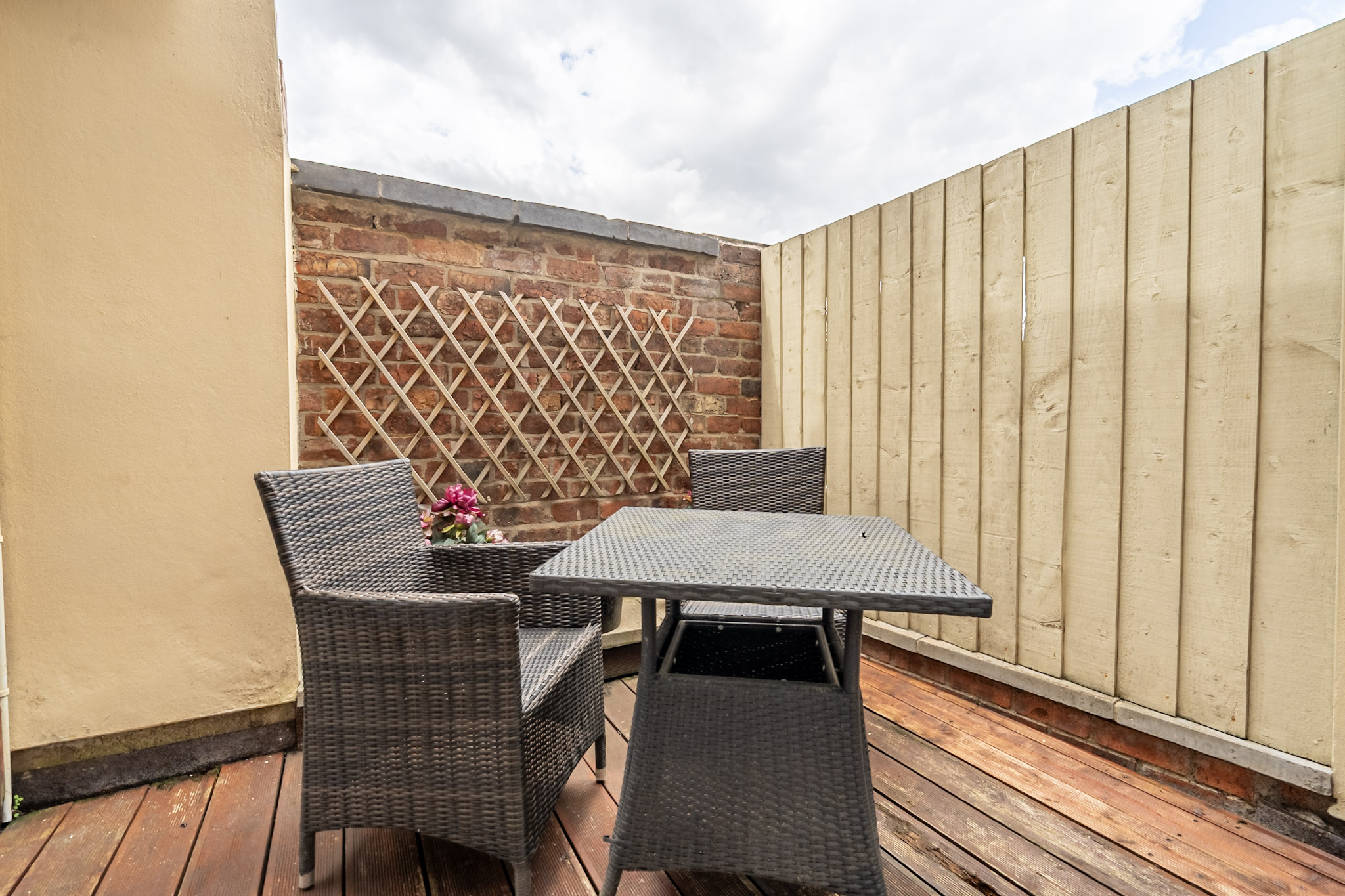 Inside, guests will find ornate ceiling mouldings, Bose audio, blackout curtains, leather dining chairs, and high-speed Wi-Fi. The bathroom includes a shower over bath and complimentary toiletries. This suite offers more room to unwind and is ideal for those seeking an extended stay or a touch of outdoor space in the heart of Cheltenham.