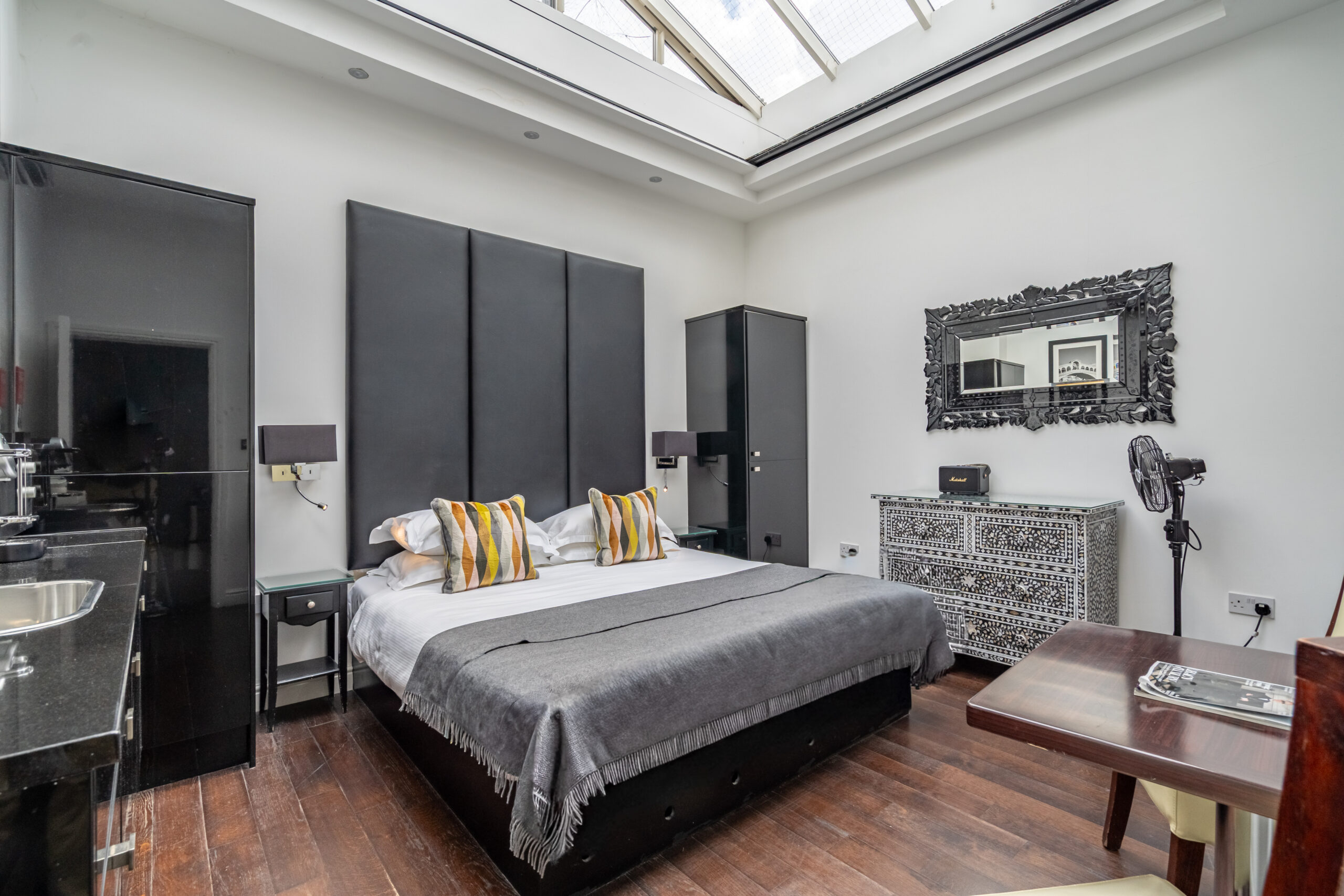 Compact and full of charm, the Palermo Studio is a 301 sq. ft. self-contained studio suite with a super king-size bed, modern furnishings, and a kitchenette for light self-catering. Its standout feature is the full-length skylight atrium with a retractable electric blind, providing abundant natural light during the day and privacy at night.